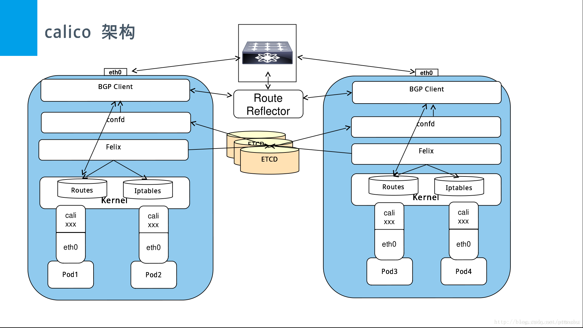 在 Calico 中,最常见的 BGP 组件是 BIRD,配置为 Route Reflector 运行,而非标准 BGP 客户端。