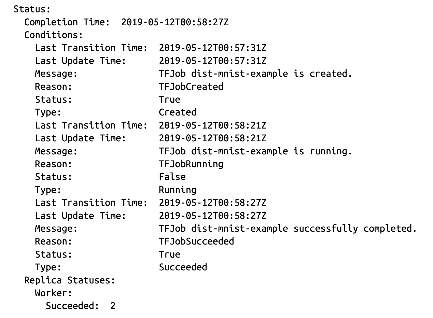 请注意,Replica Statuses 字段显示了每种副本类型的状态细分。当所有 worker 完成时,TFJob 即成功完成。如果任何 worker 失败,则 TFJob 的状态也会显示为失败。