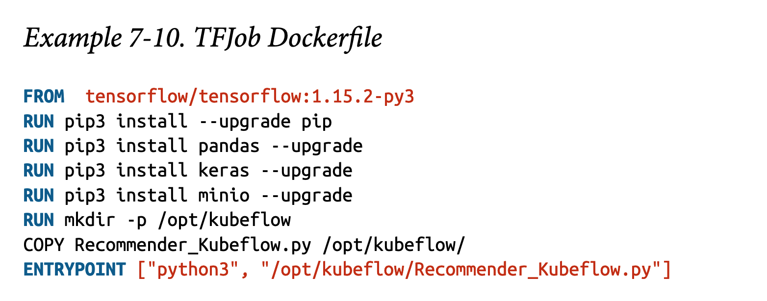 我们将首先将推荐系统部署为单容器的TFJob。由于我们已经有了一个Python notebook,将其导出为Python文件非常简单——只需选择“文件”,然后选择“下载为”并选择“Python”。这将把notebook保存为可执行的Python文件。下一步是将训练代码打包到容器中。这可以通过Dockerfile完成,如示例7-10所示。