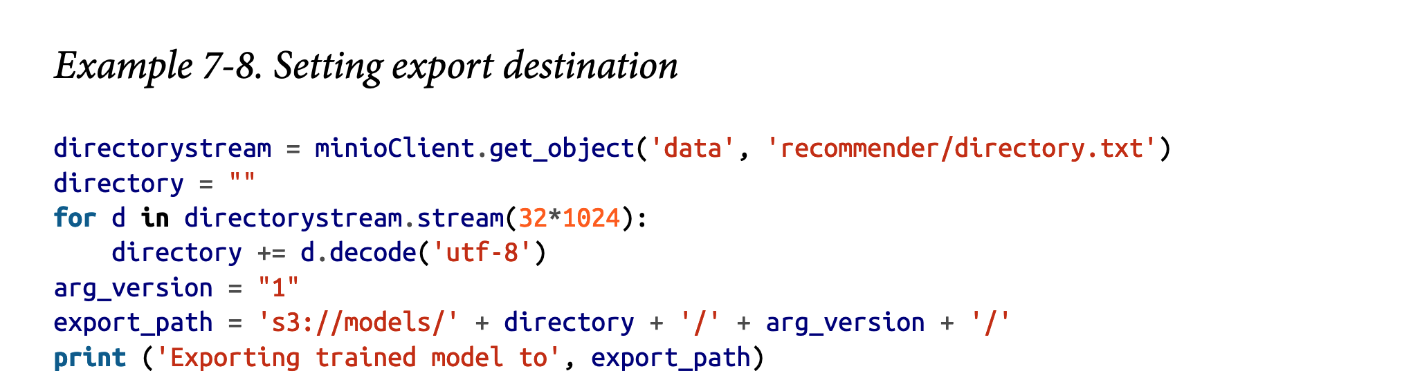 恭喜:您已成功在Jupyter Notebook中训练了一个TensorFlow模型。但我们还没有完全结束——为了以后能够使用我们的模型,我们应该先将其导出。您可以通过使用MinIO Client设置导出目标来完成此操作,如示例7-8所示。
