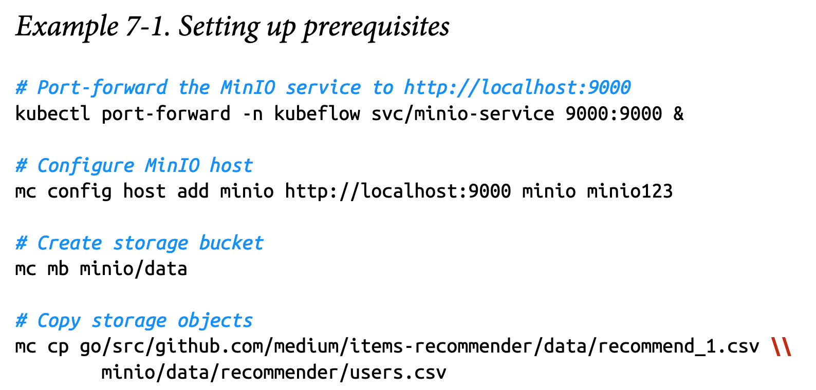 让我们从下载所需的准备工作开始。你可以从本书的GitHub仓库下载notebook。要运行notebook,你需要一个包含MinIO服务的Kubeflow集群。请参考第33页的“支持组件”来配置MinIO。确保MinIO客户端(“mc”)也已安装。我们还需要准备数据以便进行训练:你可以从这个GitHub网站下载用户购买历史数据。然后,你可以使用MinIO客户端创建存储对象,如示例7-1所示。