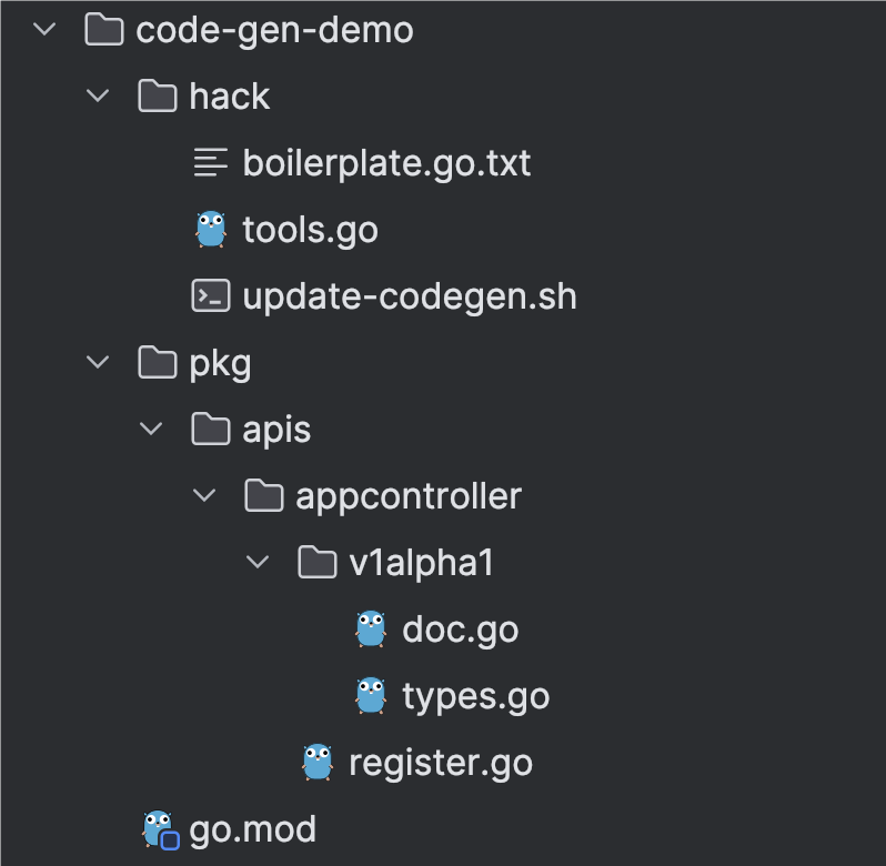 types.go:编写crd的资源结构,code-generator 的注释 tag 一般写在这边里面doc.go:声明了按照 package 维度,为所有 structs 提供生成的声明register.go:提供注册到 runtime.Scheme 的函数。code-generator 的 register-gen 可以读取 doc.go 中的 // +groupName,并生成 register.go