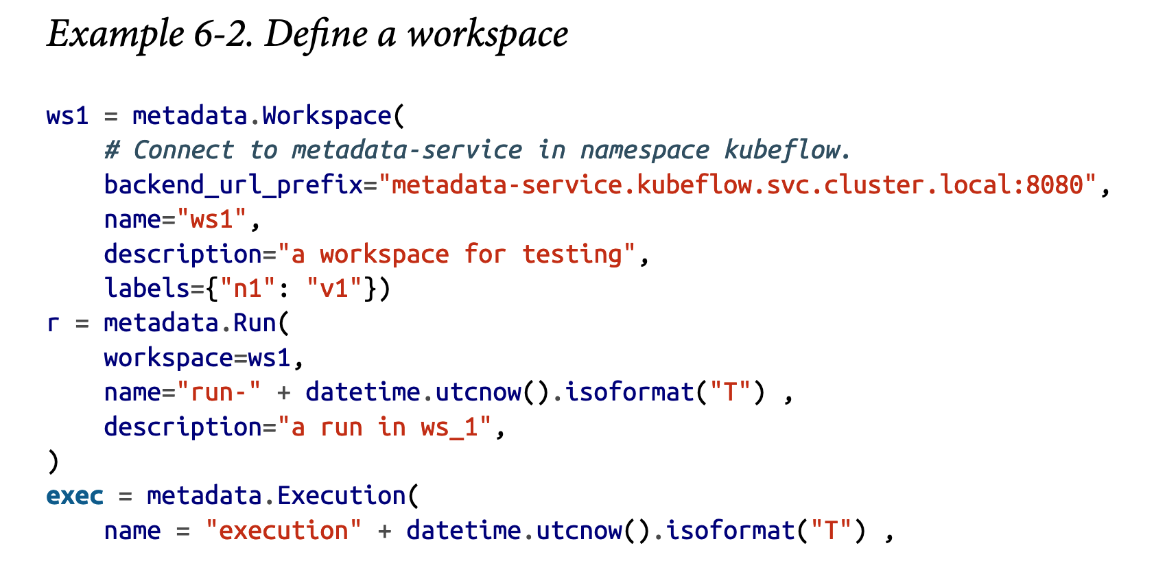 在Kubeflow元数据中,所有信息都是根据workspace、run和execution来组织的。您需要定义一个workspace,以便Kubeflow可以跟踪和组织记录。示例6-2中的代码展示了如何实现这一点