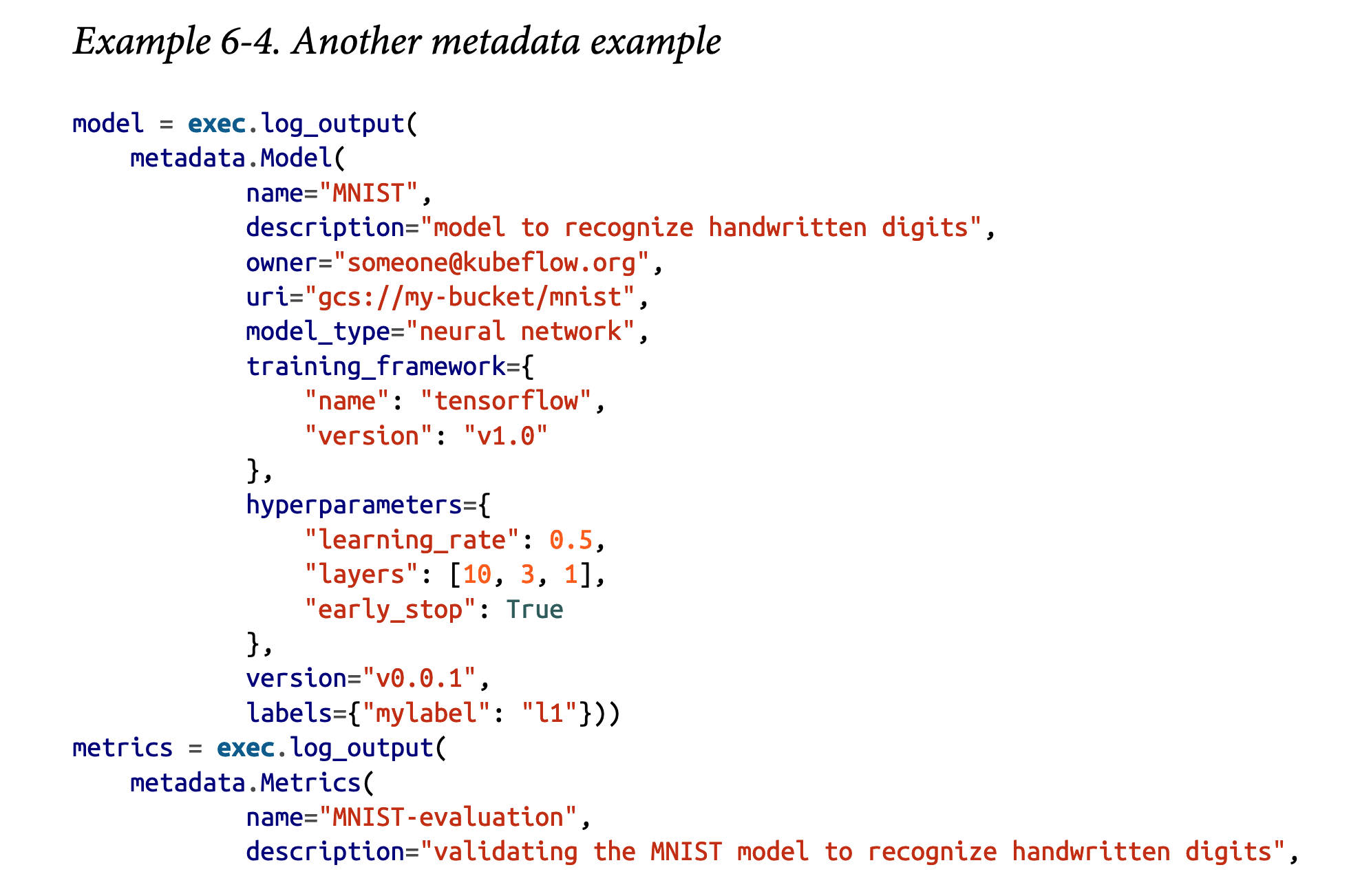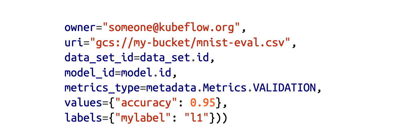 除了数据之外,Kubeflow元数据还允许您存储有关模型及其指标的信息。实现它的代码在示例6-4中给出。