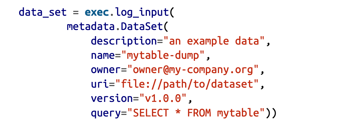 Kubeflow不会自动跟踪应用程序使用的数据集。它们必须在代码中显式注册。按照经典的MNIST示例,元数据中的数据集注册应如示例6-3所示实现
